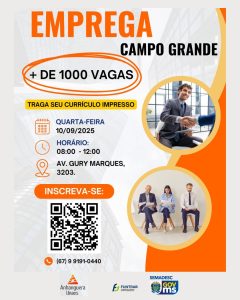 Campo Grande recebe o 1º Emprega Campo Grande, evento promovido pelo Centro Universitário Anhanguera Unaes, em parceria com a Funtrab (Fundação do Trabalho de Mato Grosso do Sul). A ação ocorre nesta quarta-feira (10/09), a partir das 8 horas, na unidade da Anhanguera ( Av. Gury Marques, 3203, Vila Olinda ).