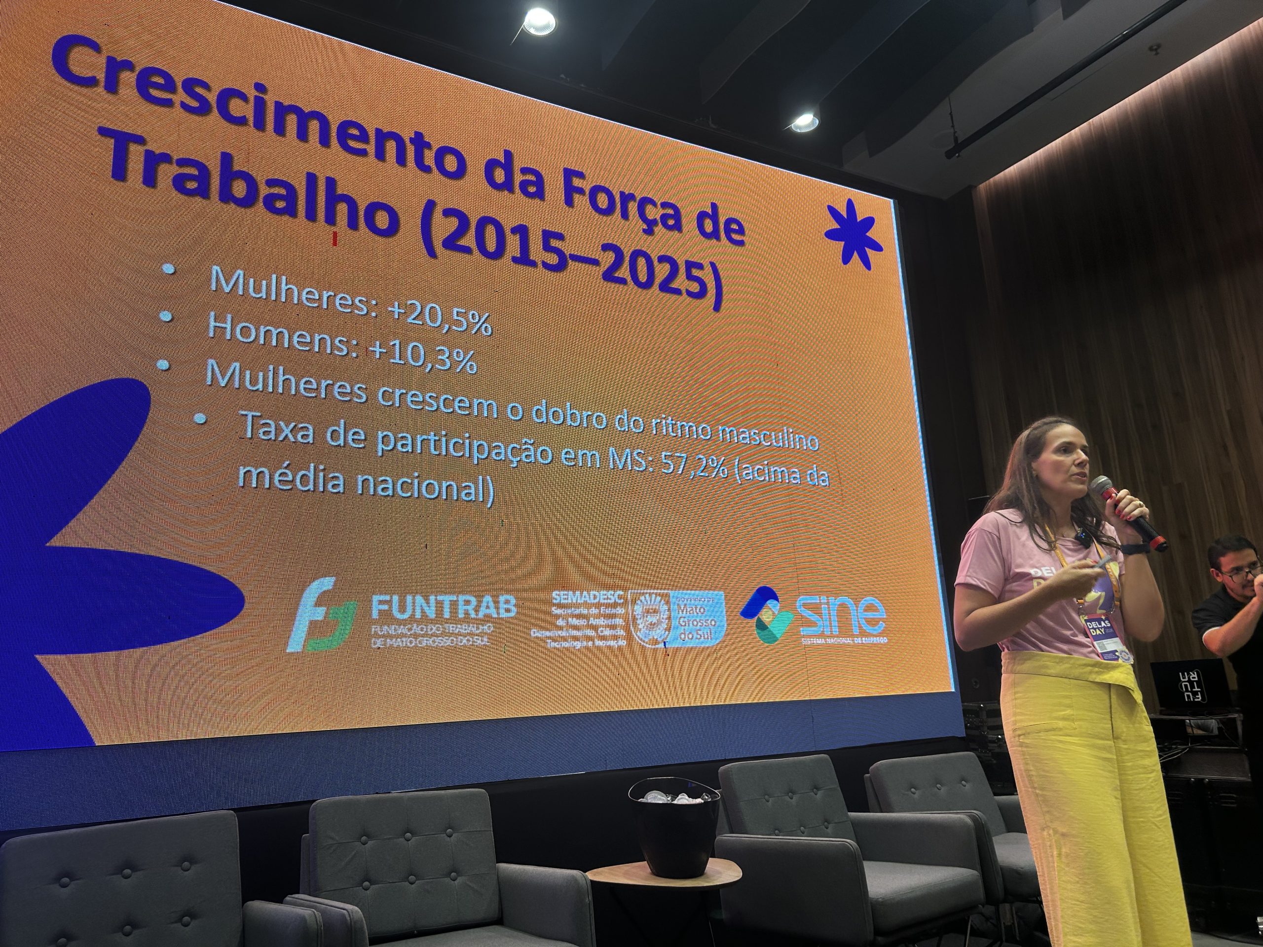 Durante a fala, dados evidenciaram a crescente presença feminina na economia. Entre 2015 e 2025, a força de trabalho feminina cresceu 20,5%, o dobro do ritmo masculino, que registrou aumento de 10,3%. Em Mato Grosso do Sul, a taxa de participação feminina chegou a 57,2%, superando a média nacional.