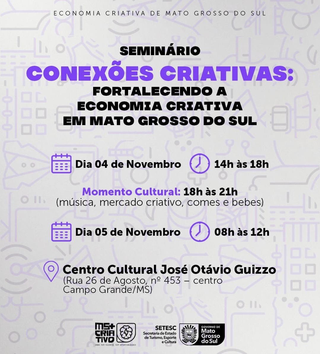 Com o objetivo de fortalecer a rede de gestores e empreendedores culturais de Mato Grosso do Sul, o Governo do Estado, por meio da Secretaria de Estado de Turismo, Esporte e Cultura (Setesc), promove nos dias 4 e 5 de novembro (terça e quarta-feira), no Centro Cultural José Octávio Guizzo, em Campo Grande, o seminário “Conexões Criativas: Fortalecendo a Economia Criativa em Mato Grosso do Sul”.